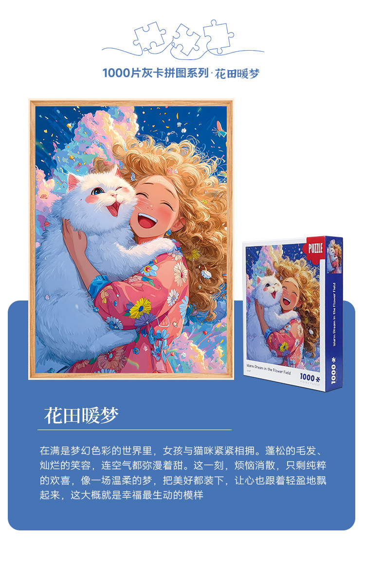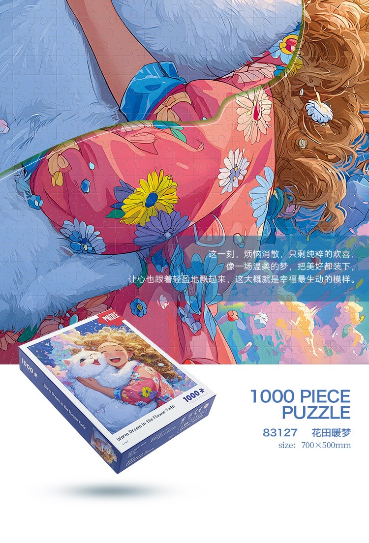 拼圖名稱:花田暖夢-83127 拼圖尺寸:700*500MM 拼圖材質:紙質灰卡 拼圖片數:1000片 加工方式:廠規、來圖定制 包裝尺寸:180*130*50mm