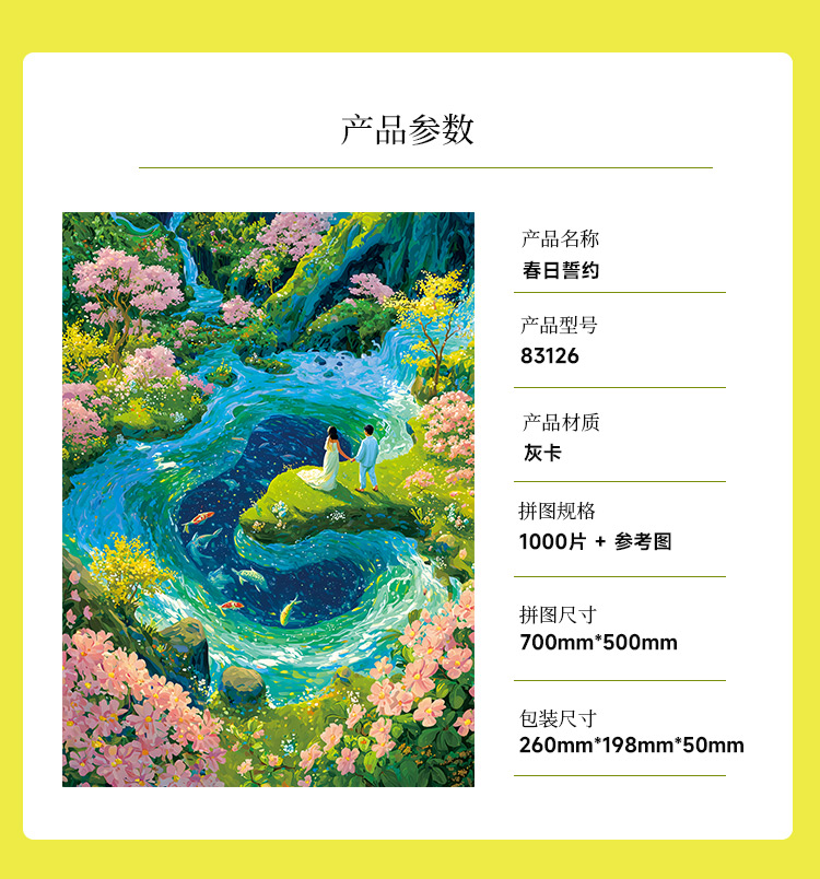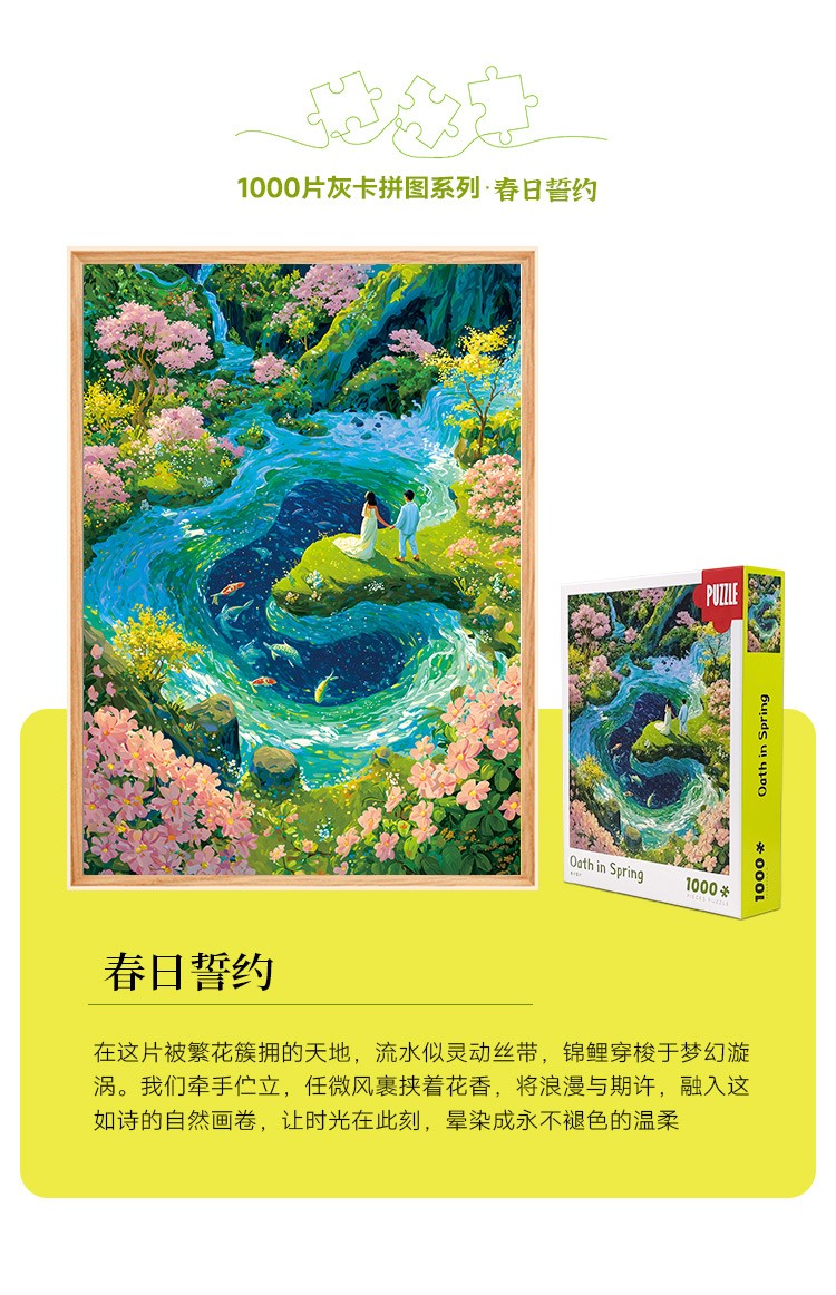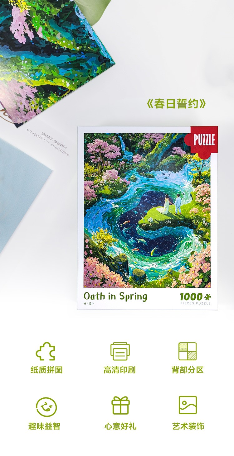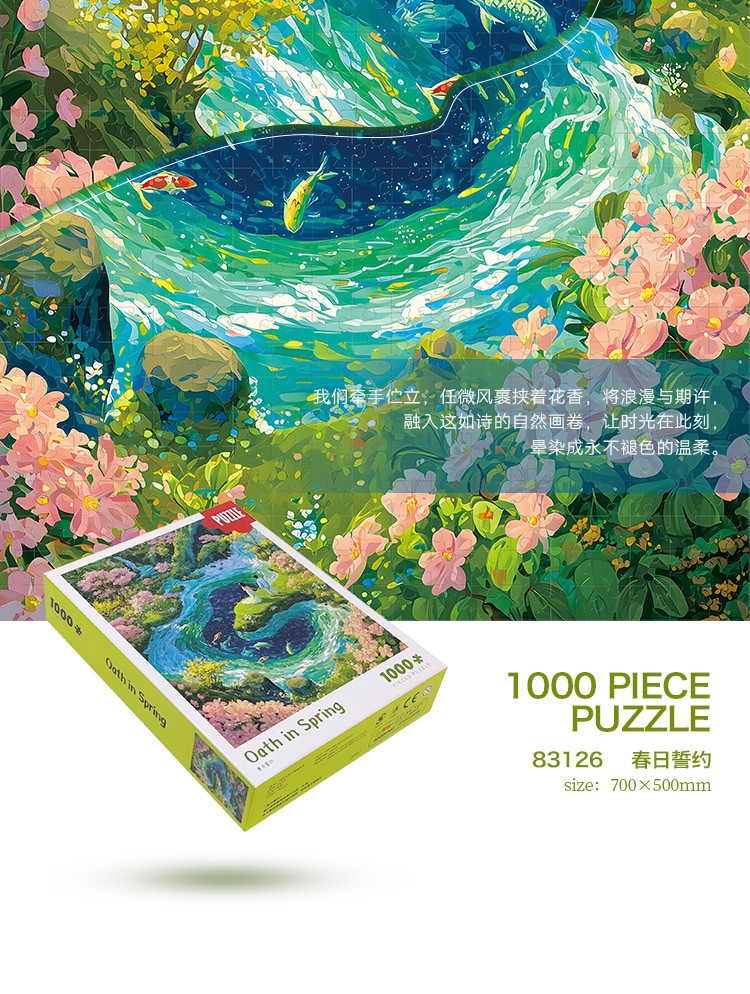 拼圖名稱:春日誓約-83126 拼圖尺寸:700*500MM 拼圖材質:紙質灰卡 拼圖片數:1000片 加工方式:廠規、來圖定制 包裝尺寸:180*130*50mm