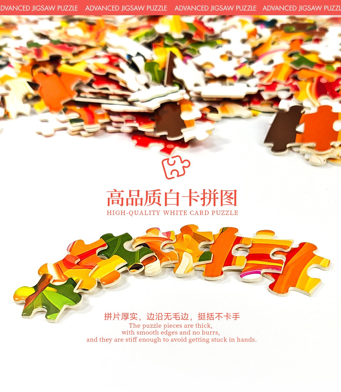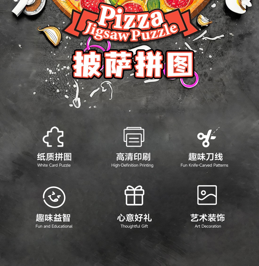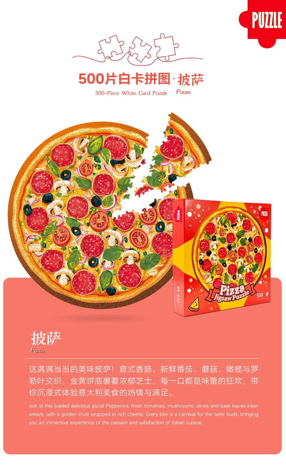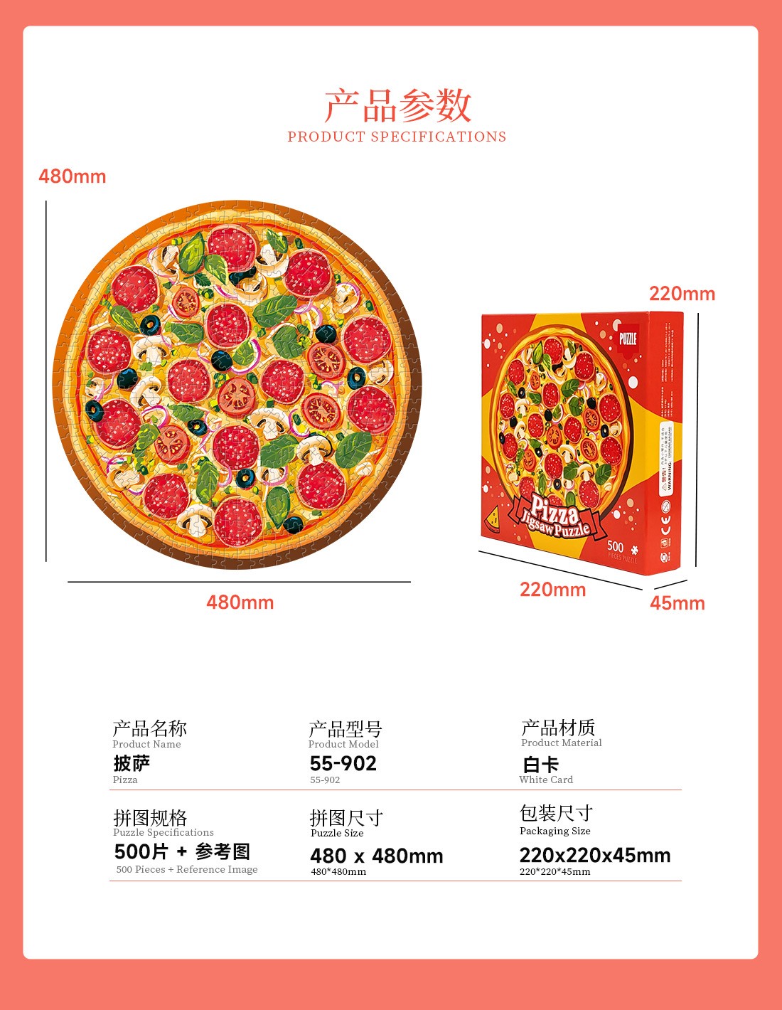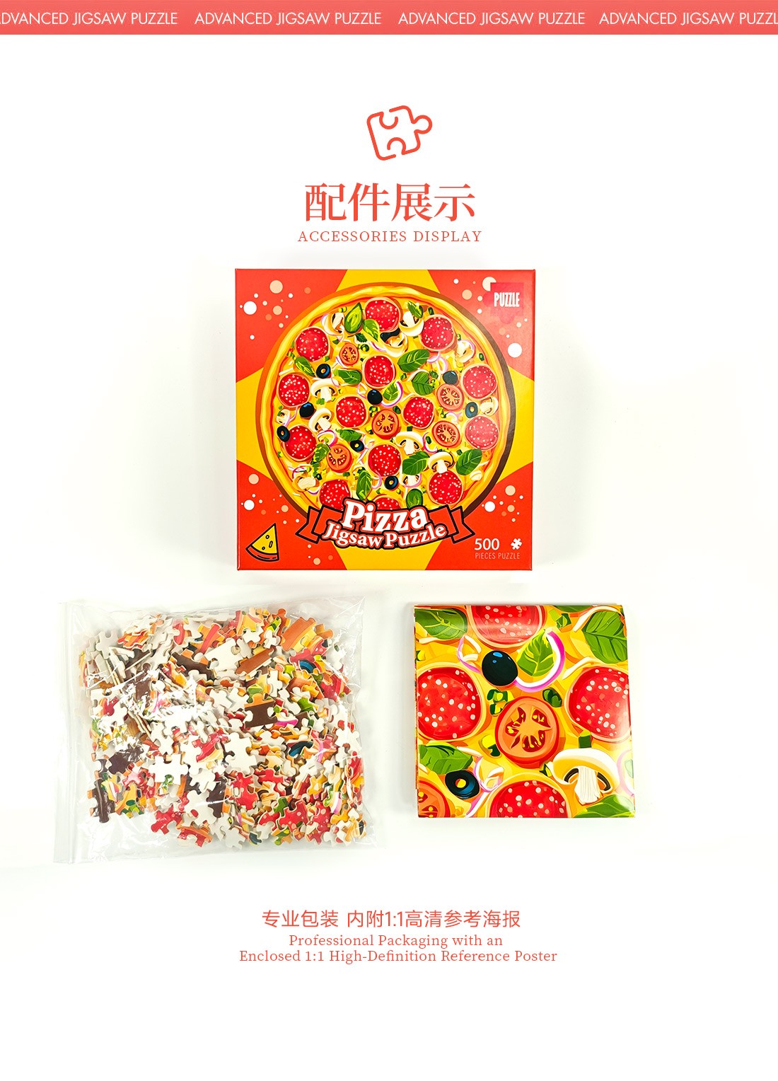 拼圖名稱:披薩-55-902 拼圖尺寸:480*480MM 拼圖材質(zhì):紙質(zhì)白卡 拼圖片數(shù):500片 加工方式:廠規(guī)、來圖定制 包裝尺寸:220*220*45mm